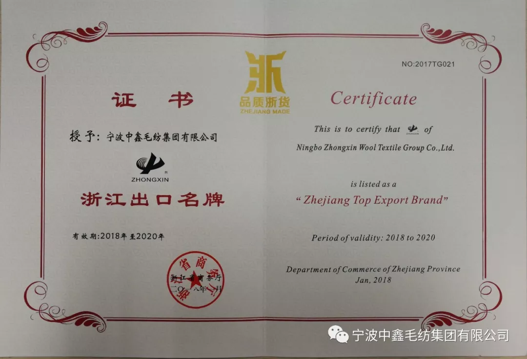 近日,宁波中鑫毛纺集团有限公司“中鑫”牌纱线再次荣获浙江省商务厅授予的2018年“浙江出口名牌”荣誉称号(有效期:2018年至2020年)。