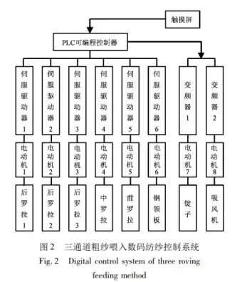 三通道粗纱异速喂入纺纱的控制系统如图2所示。由图可看到,牵伸、加捻和卷绕成型机构采用伺服电动机驱动,并由PLC进行程序控制。在普通的环锭纺纱机电子牵伸中,后罗拉是用一个伺服电动机传动,而在三通道粗纱异速喂入的数码纺纱系统中每个锭位的左、中、右3只后罗拉是用3只伺服电机分别独立驱动。