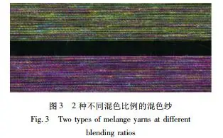 按照纱线设计的混纺比要求,上机时通过设定3根粗纱各自的喂入速度,在纺纱过程中达到混纺比要求并保持恒定。图3示出红、蓝、黄3种颜色的粗纱。图中上半部分为按红/蓝/黄(20/30/50)混色比的纱线,下半部分为按红/蓝/黄(50/30/20)混色比的纱线。