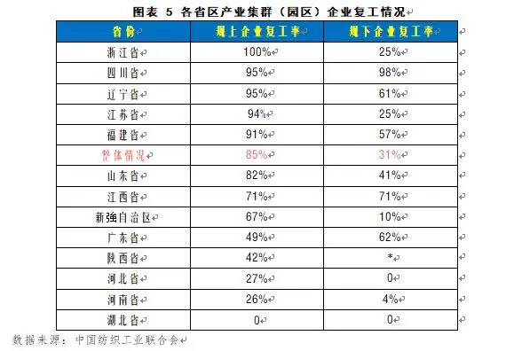 延期复工影响纺织服装企业恢复生产。受疫情影响,2020年一季度全国,特别是疫情严重地区的大部分企业延期复工,影响了企业生产计划,对中小企业影响较大。根据中国纺织工业联合会(以下简称中纺联)对中纺联纺织产业集群试点地区(园区)的调研,至2月28日,全国各省市集群(园区)中的规模以上企业开工率已平均达到了85%;规模以下企业开工率平均达到31%,集群(园区)的产能总体上恢复到了疫情前的40%左右。企业复工后,纺织服装企业,特别是中小企业,依然面临着工人短缺、产业链上下游企业复工不同步、订单不足、原材料供应不足、防护资源缺乏等多方面的困难和问题。