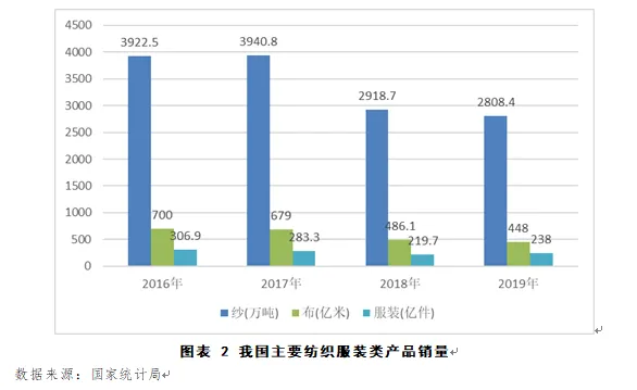 中国纺织服装产量继续保持下降趋势。近年来,受经济增速放缓、供给侧改革、中美贸易摩擦及产能转移等因素影响,我国服装行业整体发展较为低迷。根据国家统计局数据,我国纱及布产量连续3年保持下降趋势。根据国家统计局数据,2017年纱及布产量降幅分别达到14.5%和23.8%,2018年降幅有所缩小,到2019年,我国纱产量达到2892.1万吨,同比下降2.3%;布产量575.6亿米,同比下降12.4%;与此同时,我国服装行业规模以上企业累计完成服装产量也连续4年保持负增长,但降幅较小,基本保持稳定,到2019年,服装行业规模以上企业累计完成服装产量达到244.72亿件,同比下降3.28%。注:同比增速数据由于规模以上企业数量变动,每年统计口径有所不同,同比数据均为当年规模以上企业生产数据与上年进行同比。