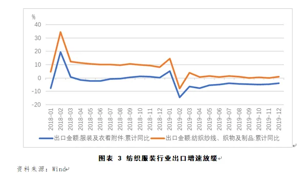 盈利方面,2019年,纺织服装行业整体承压,特别是上游纺织行业。根据国家统计局数据,2019年,3.5万户规模以上纺织企业实现营业收入49436.4亿元,同比减少1.5%,增速低于2018年4.4个百分点;实现利润总额2251.4亿元,同比减少11.6%,增速低于上年19.6个百分点,企业盈利能力较上年同期大幅下降。不过,终端行业利润率水平相对稳定,2019年1-12月,服装行业规模以上企业累计实现营业收入16010.33亿元,同比下降3.45%;利润总额872.83亿元,同比下降9.75%;但营业收入利润率为5.45%,比2018年同期下降0.38个百分点。 受外需减弱、中美贸易摩擦及产能转移的影响,纺织行业出口增速放缓。根据中国海关数据,2019年我国纺织品服装累计出口金额为2807亿美元,同比减少1.5%,增速低于上年5.3个百分点。从产品结构来看,纺织品出口金额为1272.5亿美元,同比增长1.4%;服装出口金额为1534.5亿元,同比减少3.7%。纺织品出口好于服装,主要是由于我国服装制造业产能向东南亚等低成本国家转移,而这些国家,如越南、孟加拉国等,对纱线和面料等原材料主要依赖进口,导致对上游纺织品需求增大。由于价格和运输成本原因,这些国家进口的纺织品主要来自中国。