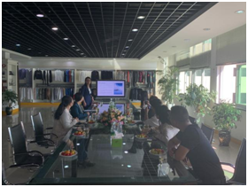 考察学习团一行来到宁波狮丹努集团股份有限公司,公司总经理许总、副总经理岑总和人力资源部杨经理热情接待了大家,首先岑总介绍了狮丹努的整体情况,就科技创新,智能创新,绿色生态创新和数字创新四方面与临沧市人社局各局长做了交流,人力资源部杨经理就狮丹努人才管理和人员福利等方面给大家做了介绍并表示会帮助临沧来甬学习人员制作出舒适好看有临沧特色的针织面料服饰。