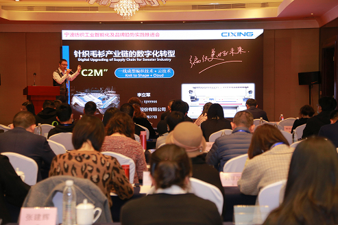浙江智能制造专家委员会特聘专家、宁波慈星股份有限公司副总经理李立军和大家分享了"针织毛衫产业链的数字化转型",李总介绍了全球互联网行业趋势以及工业互联前沿信息,拿“慈星C2M的平台系统构架”举例,此架构拥有全流程数字化管理,云工厂车间看板,生产数据可实时分析并拥有数字化决策辅助等功能,并向大家展示了慈星的"一线成型"技术,可以在移动端进行针织衫个性化定制,并可在基于VR的全景虚拟商店感受逛商场的乐趣。