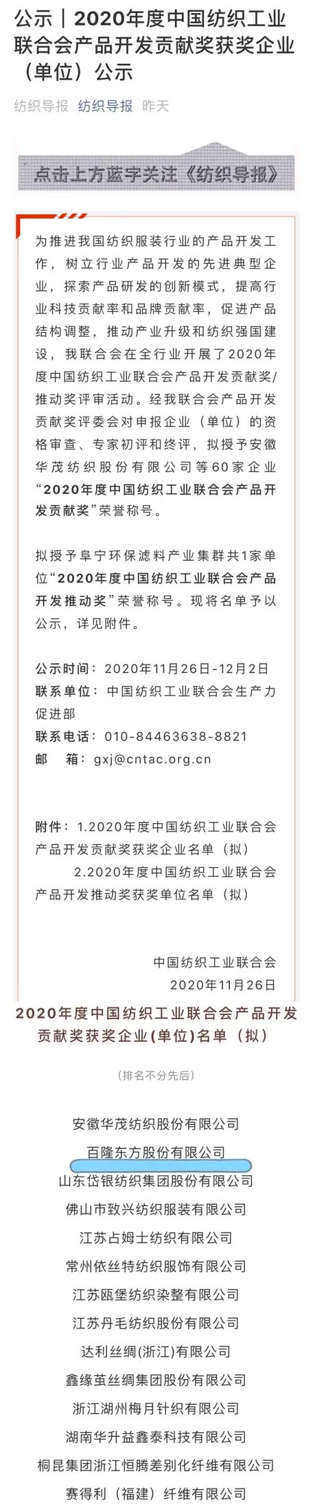 恭喜百隆东方股份有限公司荣获“年度中国纺织工业联合会产品开发贡献奖”