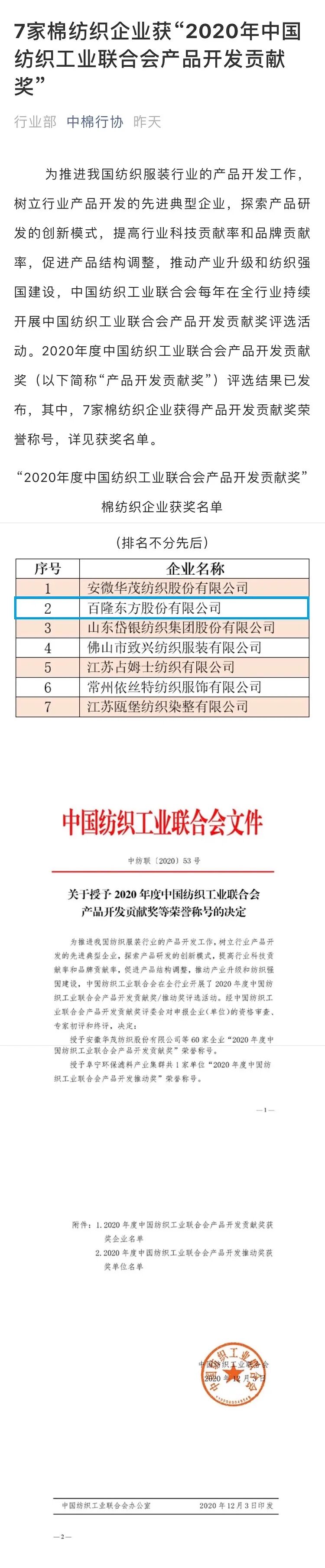 祝贺百隆东方股份有限公司荣获“2020年中国纺织工业联合会产品开发贡献奖”
