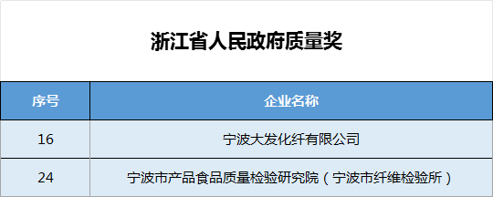 近日,浙江省各市陆续公布了拟推荐申报浙江省人民政府质量奖(省知识产权奖)名单,我协会副会长单位:宁波大发化纤有限公司、宁波市产品食品质量检验研究院(宁波市纤维检验所)荣获浙江省人民政府质量奖。宁波博洋服饰集团有限公司、宁波萌恒抽纱有限公司荣获浙江省知识产权奖拟推荐项目,向以上单位表示祝贺!