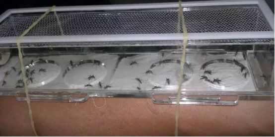 (3)向固定在前臂的驱避测试器中放入攻击力合格的白蚊伊蚊约30只,讲拉板拉出,使4个孔完全暴露,记录2min时待测试样和对照样表面停落的蚊虫数。