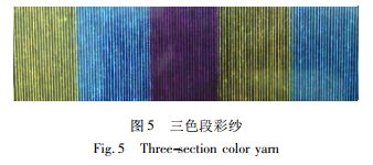 按照纱线设计的混纺比要求,上机时通过设定3根粗纱各自的喂入速度,在纺纱过程中达到混纺比要求并保持恒定。图3示出红、蓝、黄3种颜色的粗纱。图中上半部分为按红/蓝/黄(20/30/50)混色比的纱线,下半部分为按红/蓝/黄(50/30/20)混色比的纱线。
