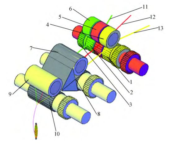 图中,1、2、3为左、中、右3个相互嵌套的轴和轴套组成的组合后罗拉,4、5、6为与3只后罗拉相对应的3只后皮辊,它们组成3根粗纱的3个喂入钳口,7、8为中皮辊和中罗拉,9、10为前皮辊和前罗拉,原前、中罗拉和皮辊的结构型式没有改变。纺纱过程中11、12、13这3根粗纱按照纱线设计要求在后罗拉处以不同的速度喂入,而在中、前罗拉处3根粗纱须条的速度是相同的,因此,发生在后-中罗拉区间的牵伸对于3根粗纱而言是异步进行,而发生在中-前罗拉区间的牵伸3根粗纱是同步进行,这就使得3根粗纱受到不同倍率的牵伸,然后再并合交汇,经加捻形成纱线。