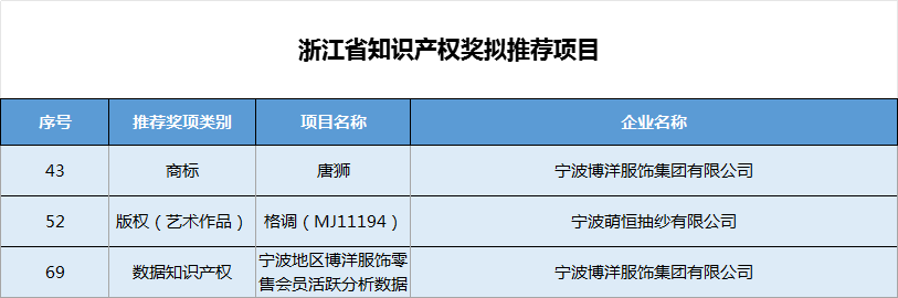 近日,浙江省各市陆续公布了拟推荐申报浙江省人民政府质量奖(省知识产权奖)名单,我协会副会长单位:宁波大发化纤有限公司、宁波市产品食品质量检验研究院(宁波市纤维检验所)荣获浙江省人民政府质量奖。宁波博洋服饰集团有限公司、宁波萌恒抽纱有限公司荣获浙江省知识产权奖拟推荐项目,向以上单位表示祝贺!